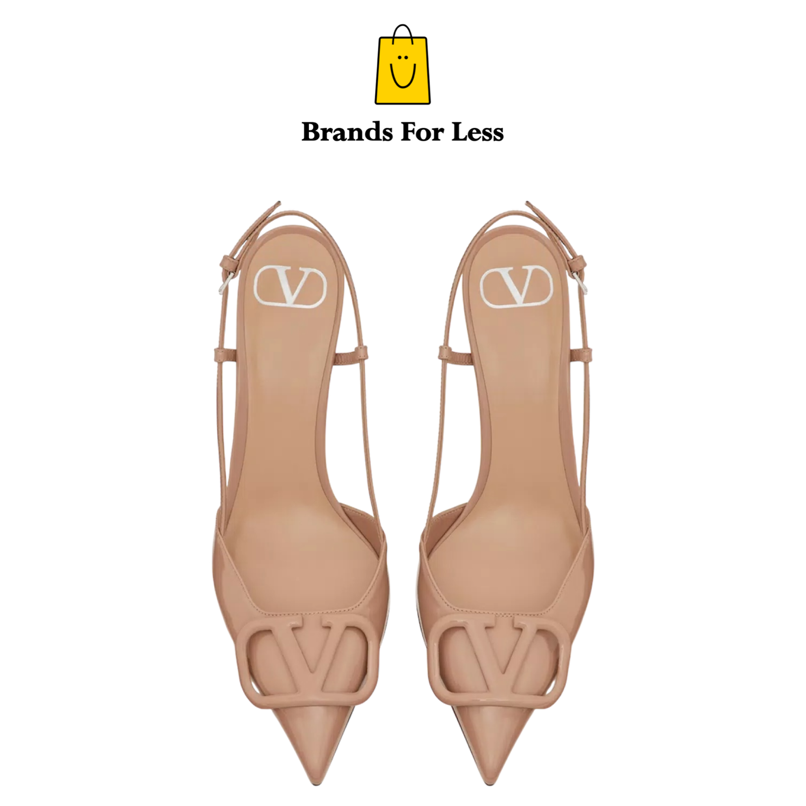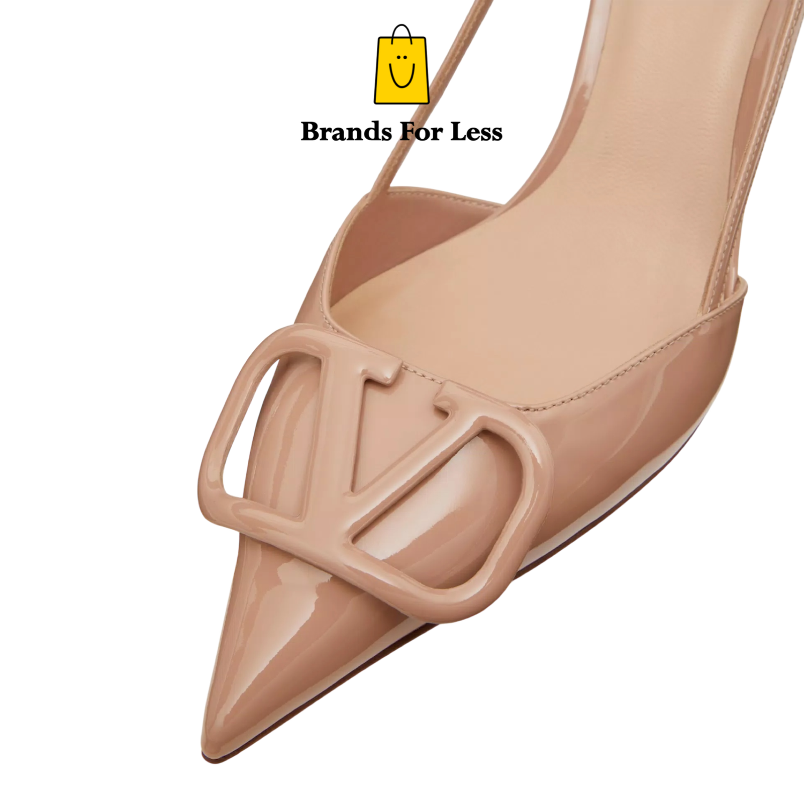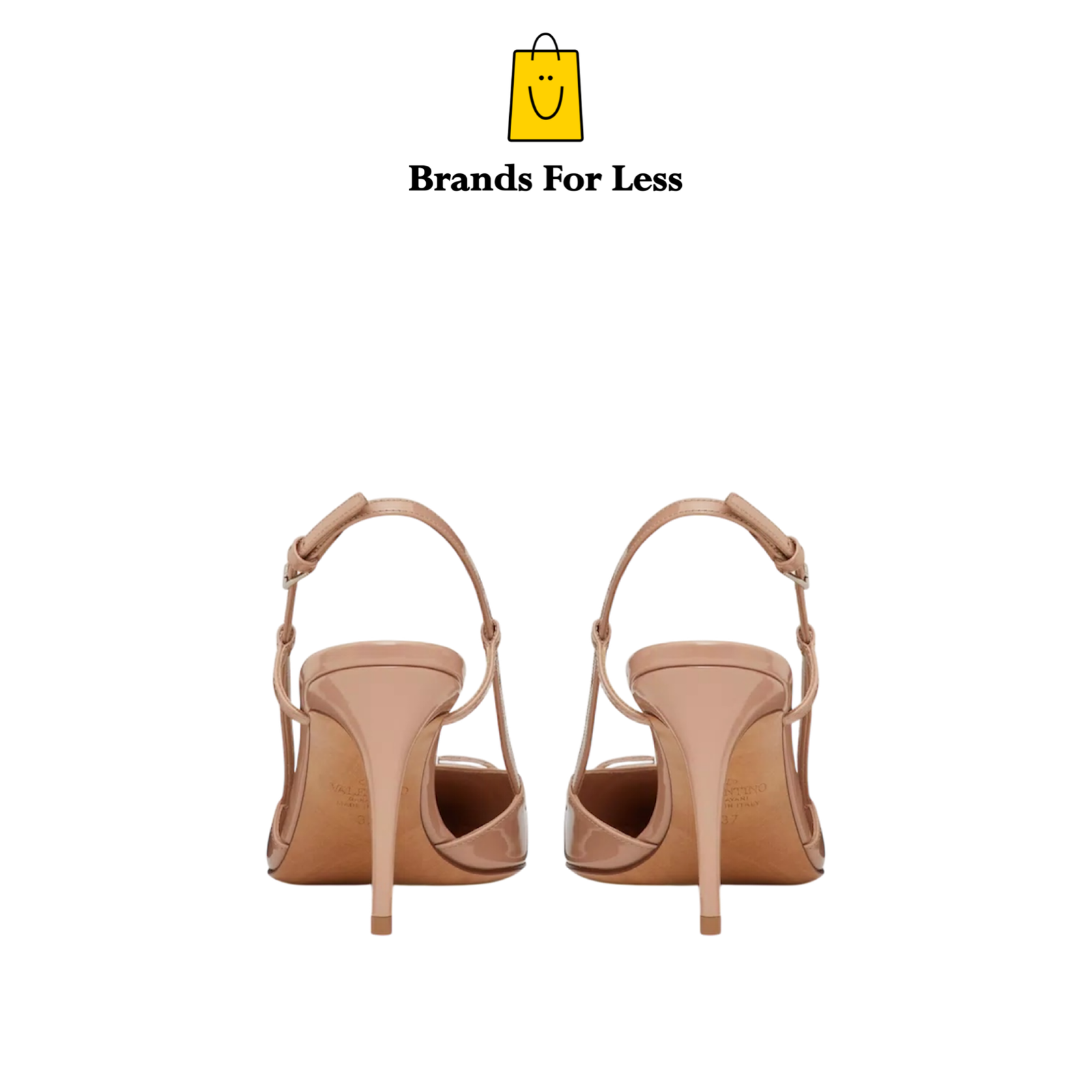 Valentino Garavani patent leather slingback pump with VLogo Signature embellishment.